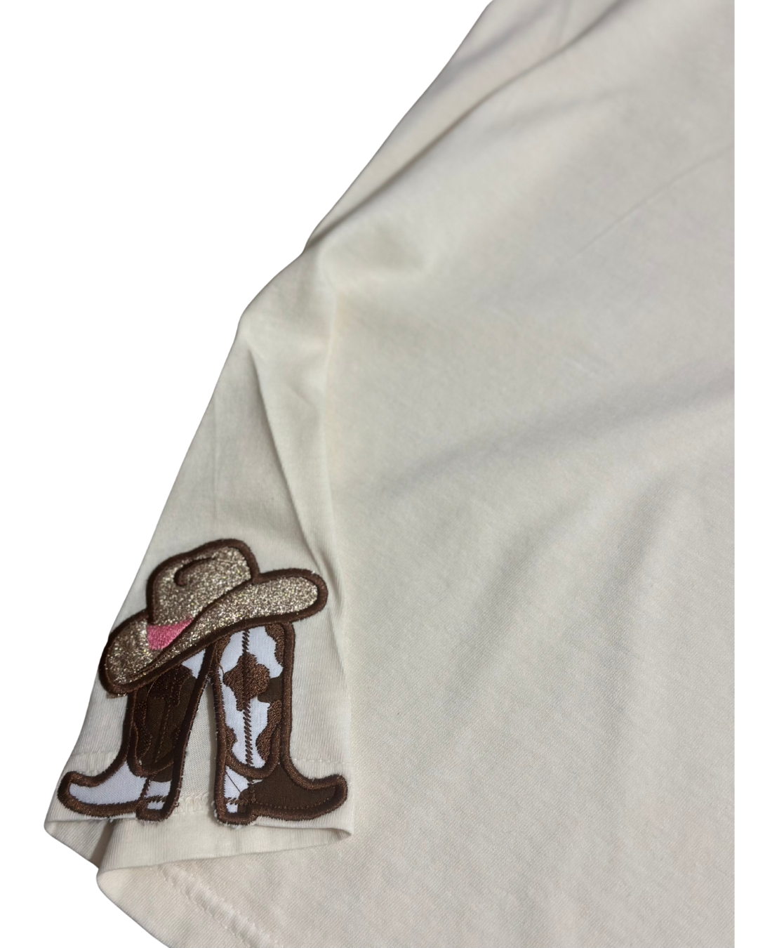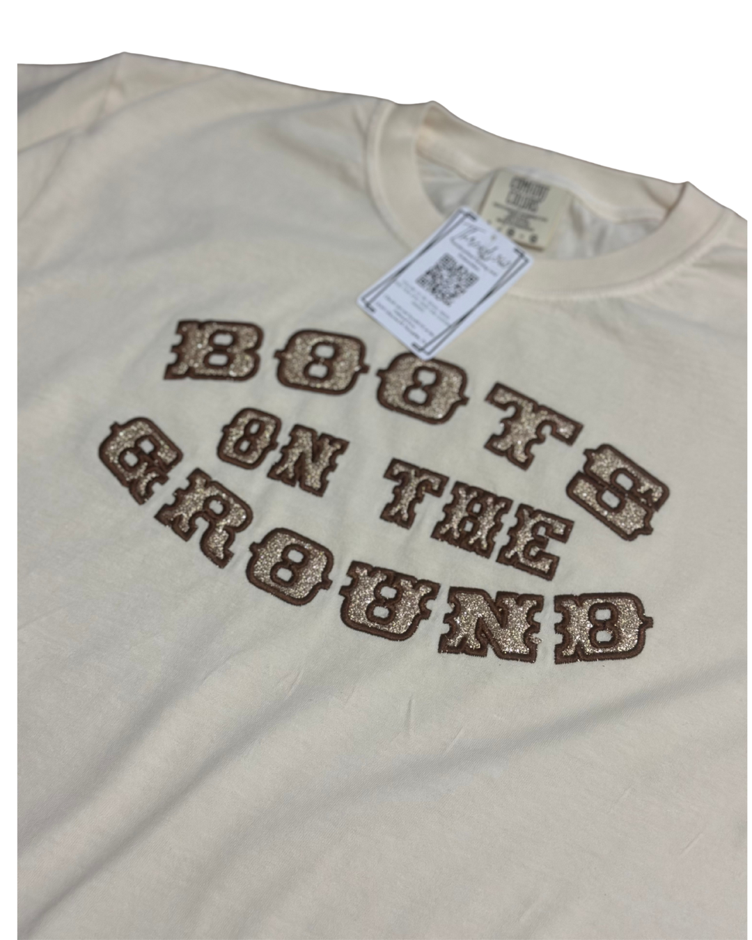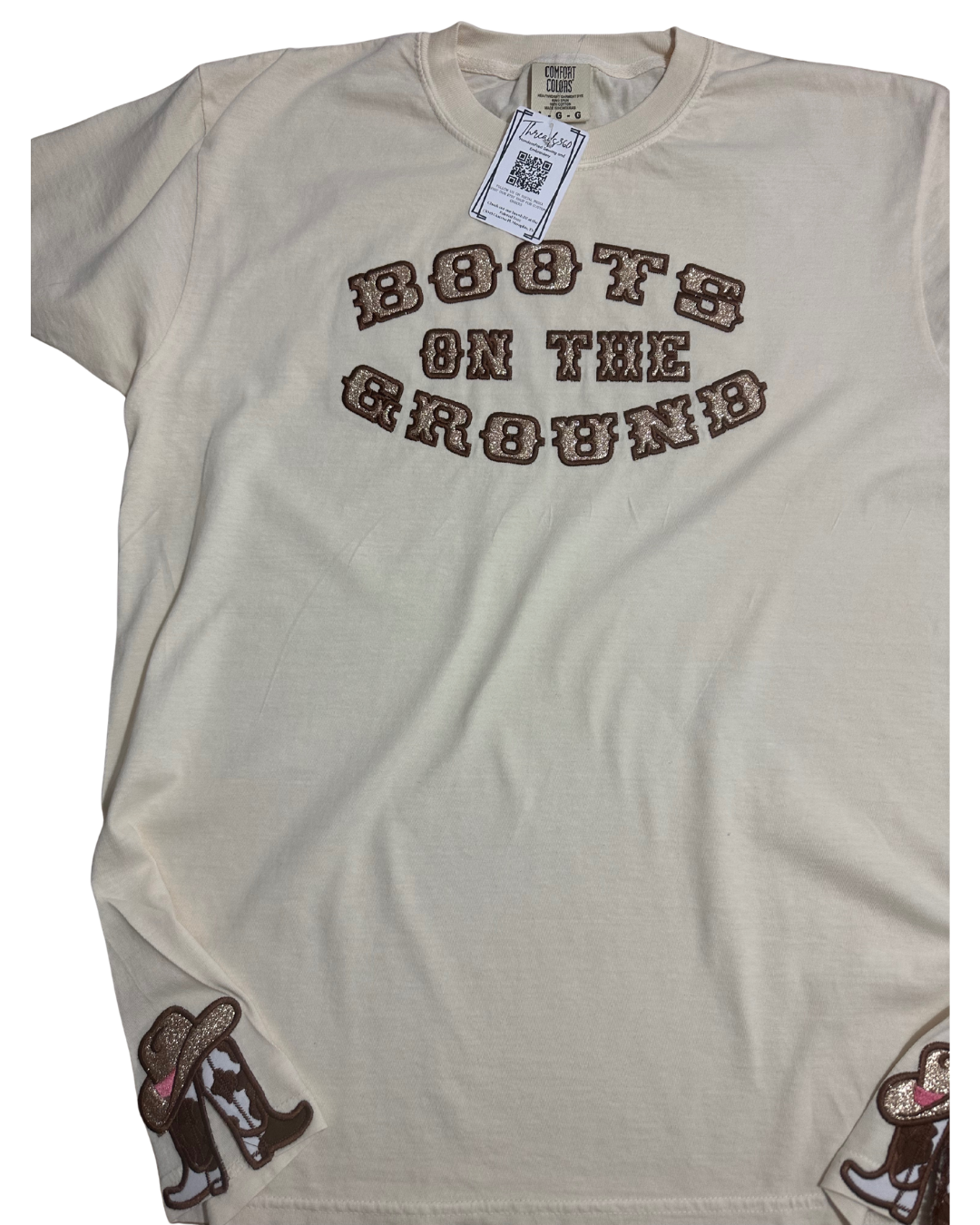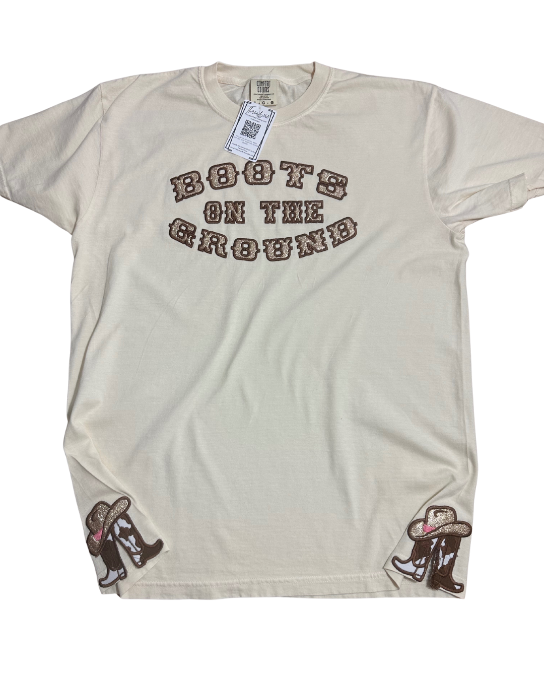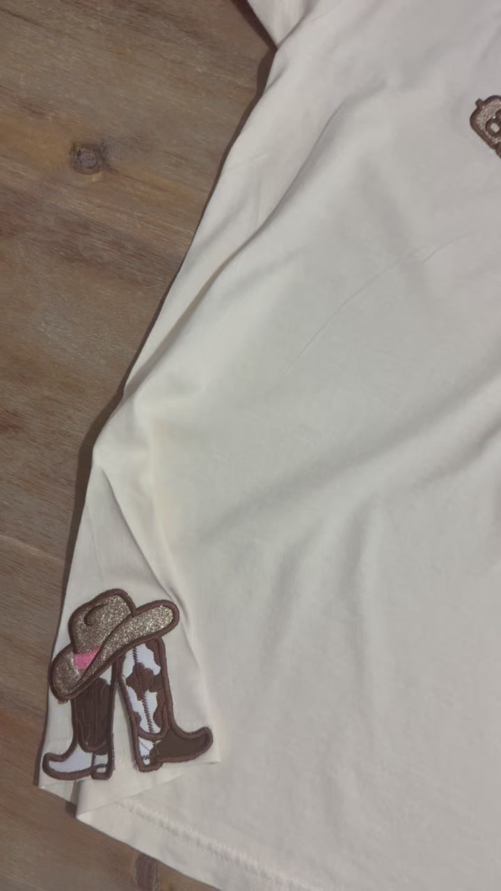 Get ready to dance in this Boots on the Ground Embroidered Shirt! This playful tee features glittery HTV lettering and adorable cowboy hat and boots appliqués along the side seam. Made with soft, high-quality Comfort Colors fabric, it’s perfect for line dancing or adding a fun country vibe to your outfit. Comfortable, stylish, and ready to boot scoot!