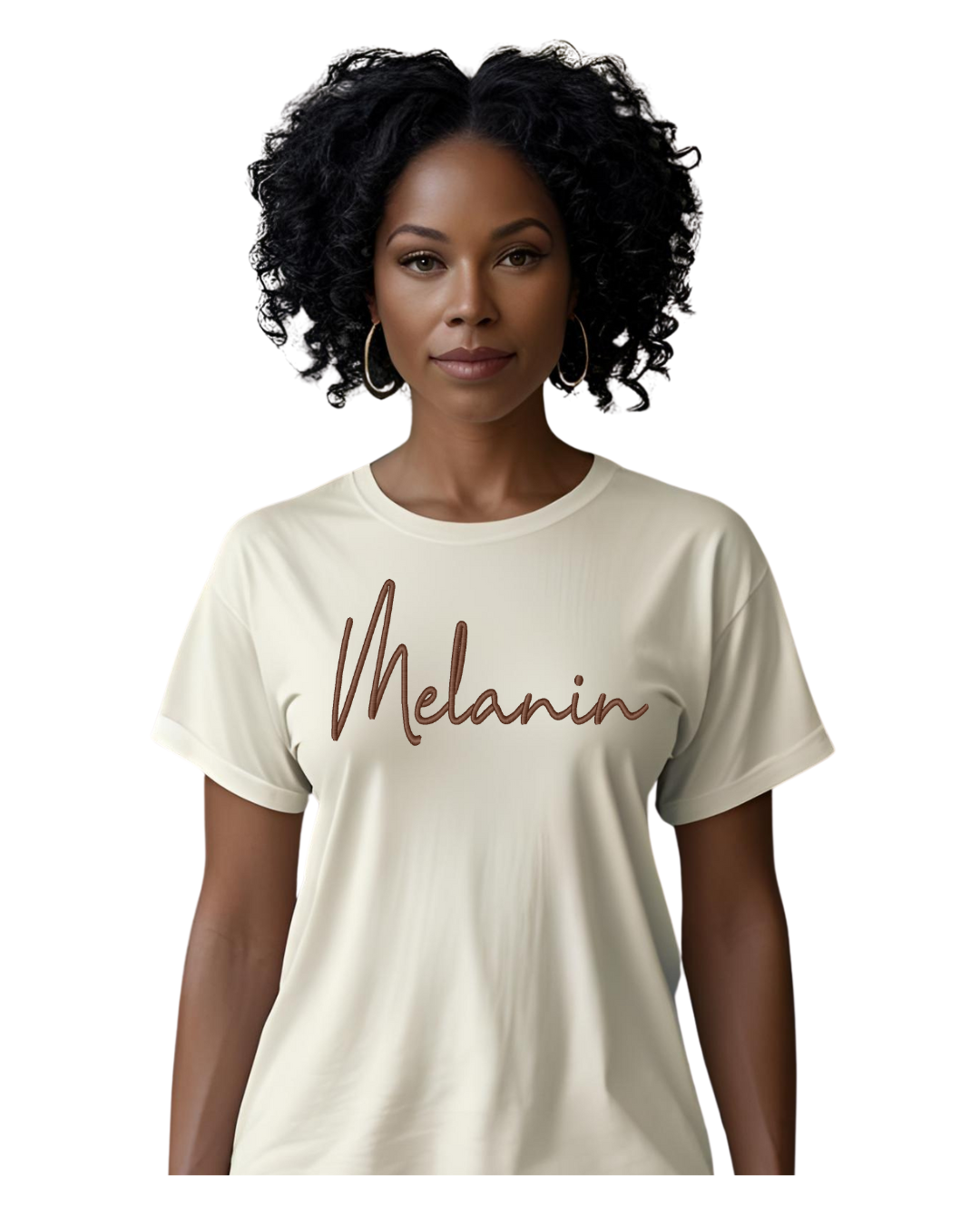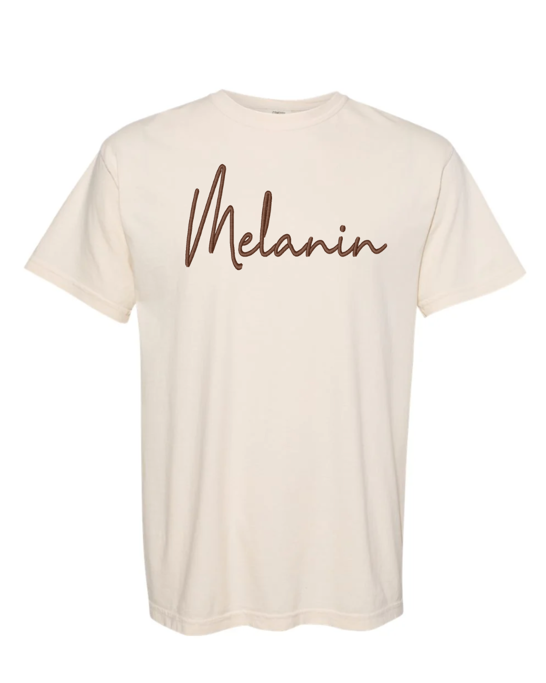 • Ivory with “melanin” embroidered in a bold dark brown