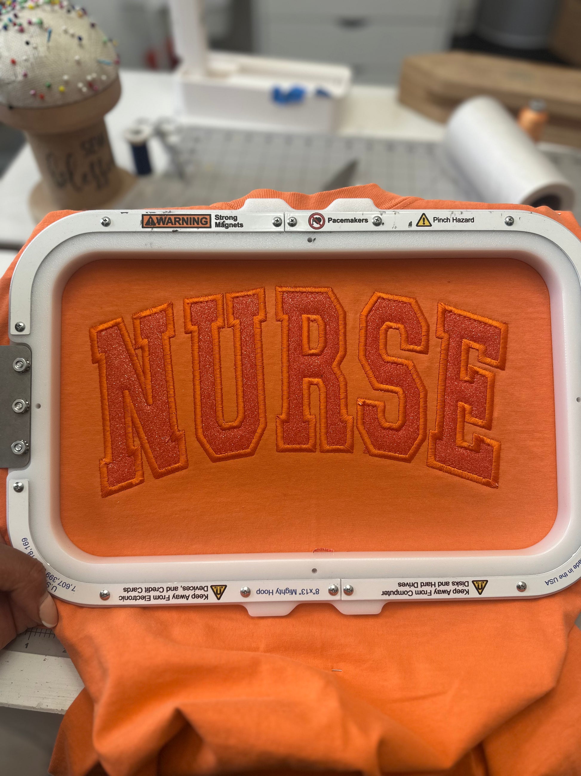 • “NURSE” design in glitter vinyl and embroidery