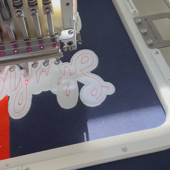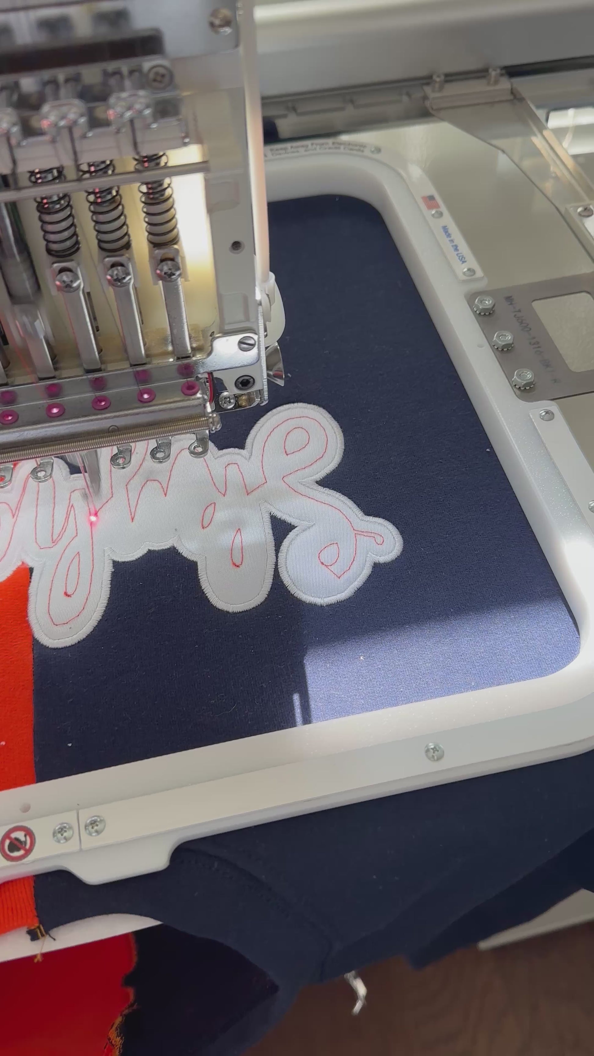 The design showcases “Skyhawks” in a stunning orange glitter HTV overlay on white twill, giving it the perfect amount of sparkle under stadium lights or fall sunshine. With a wide 11.75-inch embroidered design, every detail pops against the contrasting split background.